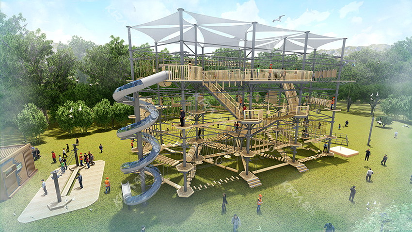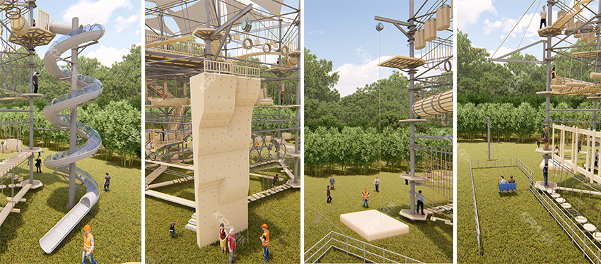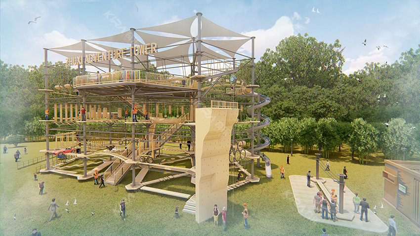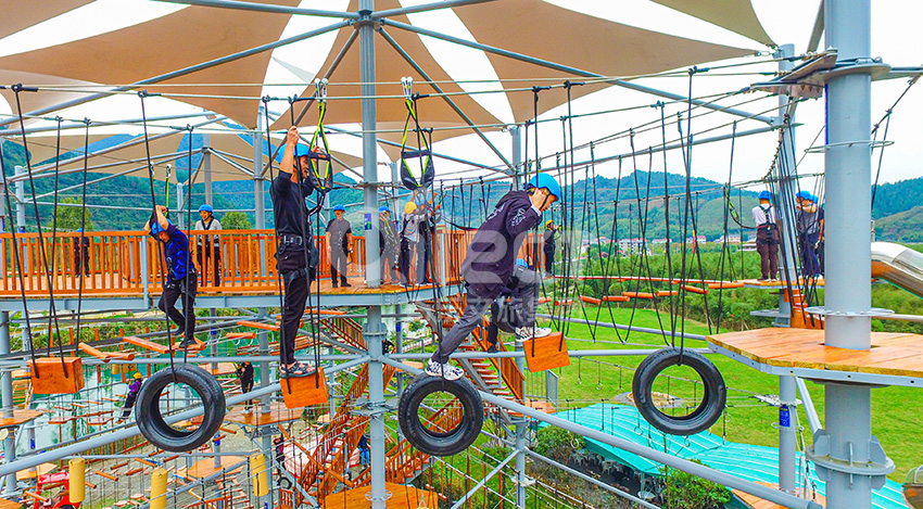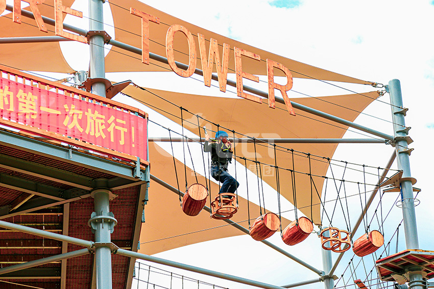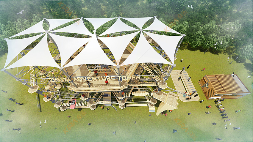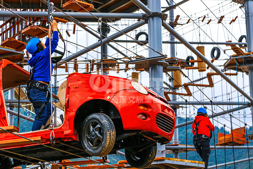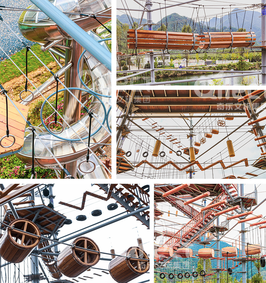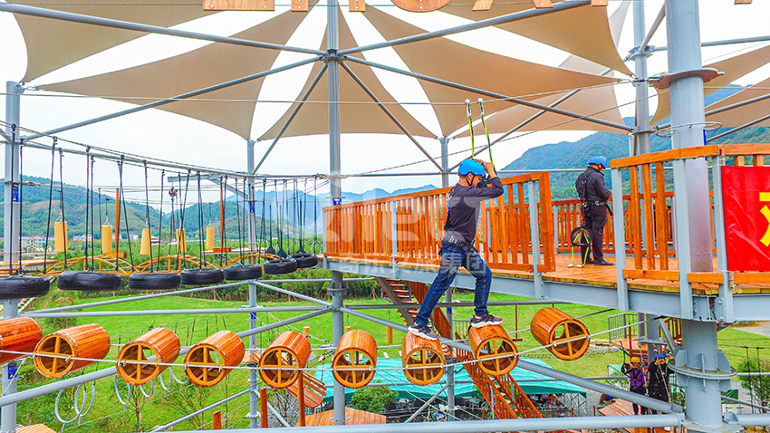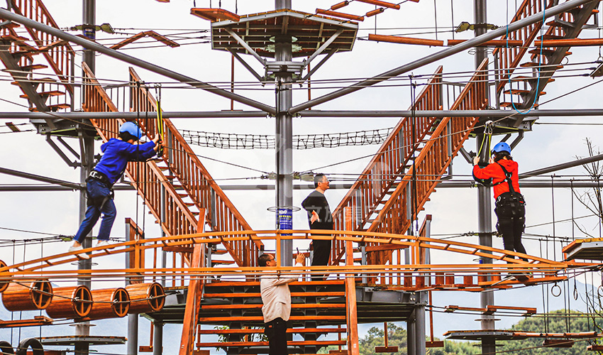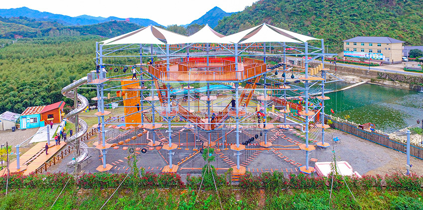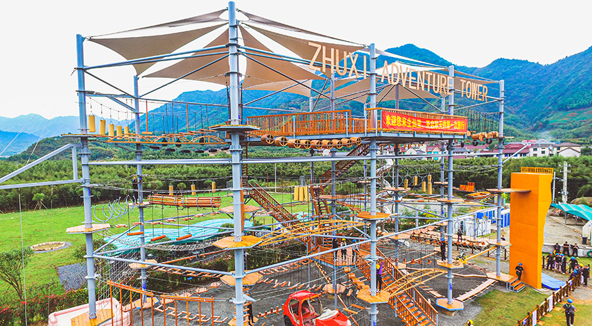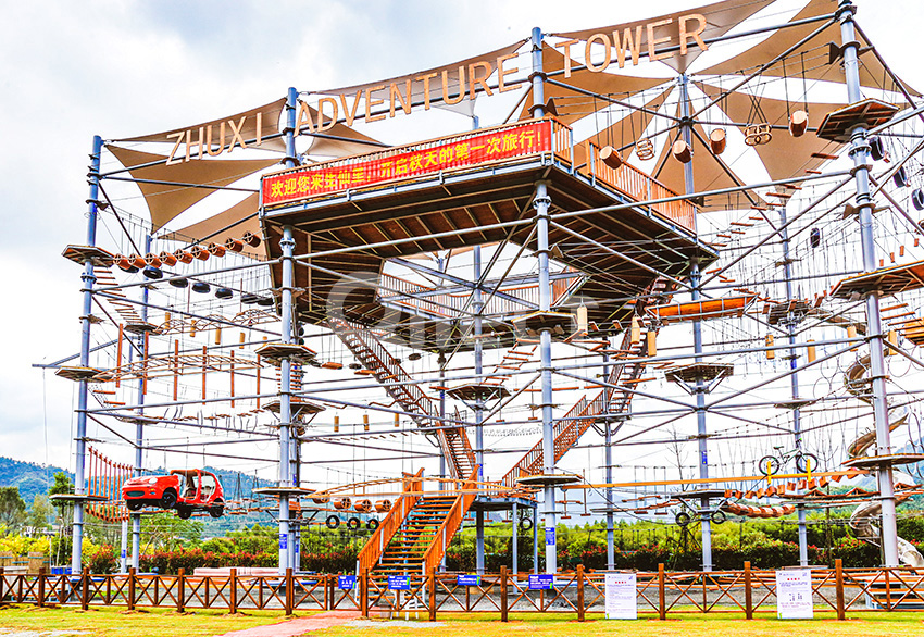 杭州桐庐县生仙里竹溪探险塔是一个汇集户外娱乐、攀岩、飞狐等项目于一身的立体娱乐综合体,是创新性的景区标志性运动游乐项目综合体,设备占地面积达到448㎡,综合用地面积达600㎡,单层高达4.3m,内部以晶体结构搭建架空层2-4个步道层级,打造层超过650米长的空中游乐路线,其中包含91个运动项目(包括尖叫滑梯、矩形秋千、低空蹦极、户外攀岩等4个),能满足150个游客同时进行冒险,被誉为运动游乐之王。