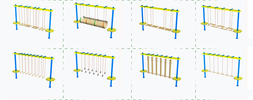 3.拓展步道受力部位采用直径16含六股钢丝的游乐绳,连接部分用静力绳,木制步道全采用防腐木,使用寿命可达10年。