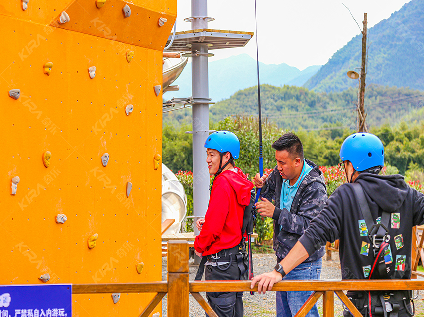 O 探险塔旁边的独立区域专门设置有教练区负责教学培训,教练区安排专业培训师为新手游客讲解入场体验注意事项以及安全装备穿戴方法,严格按照规定把好第一道关。