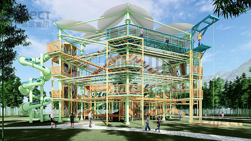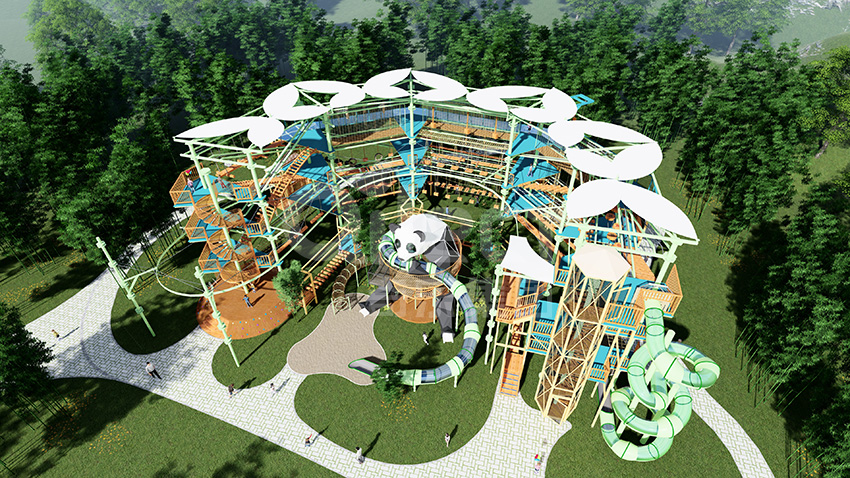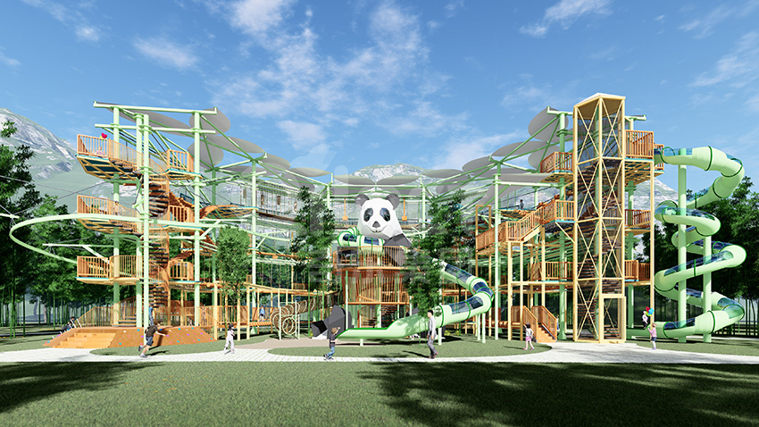 本项目适用于各种亲子主题类的乐园,巧妙运用“熊猫”IP造型设计,集拓展、探险、滑道、飞索、蹦极、不锈钢滑梯、攀岩、爬网等46种不同运动体验的文化主题项目,结合“大灰熊”IP形象,融入相关设计元素,打造差异化的网红IP主题性运动拓展营地综合体。